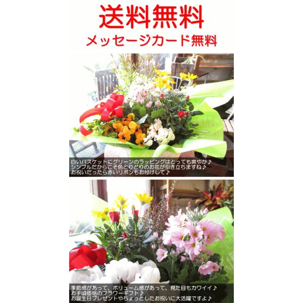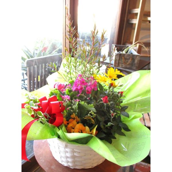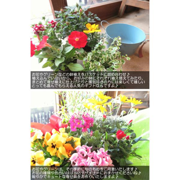 お花やグリーンなどの鉢植えをバスケットに詰め合わせ♪