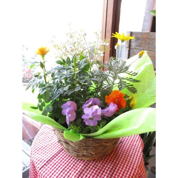 季節のおまかせポットアレンジメント ラタンバスケット ナチュラル 寄せ鉢 籐 薫る花 花苗 セット ベランダ 玄関 ガーデニング 寄せ植え