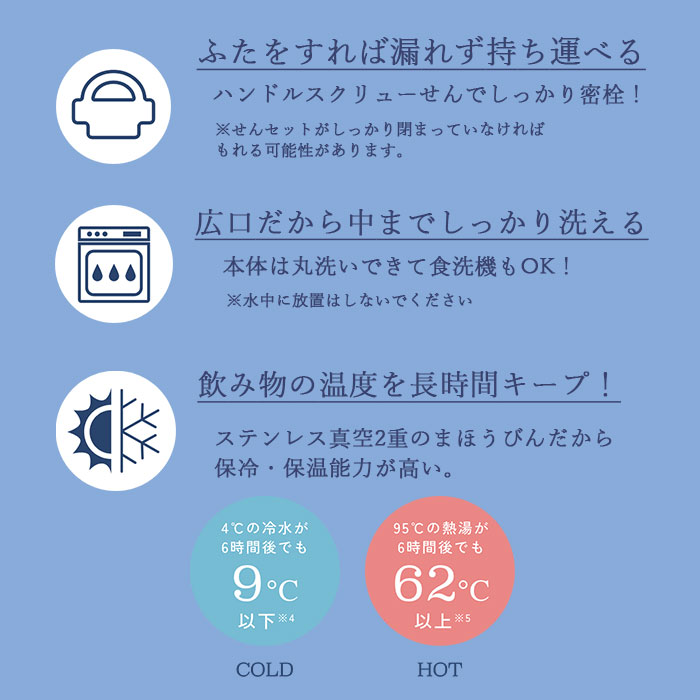 材質:ステンレス鋼(内びん、胴部、肩部)、アクリル樹脂塗装(胴部)、ポリプロピレン(せんキット)、シリコーンゴム(パッキン部)