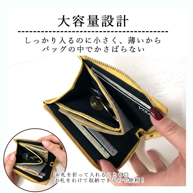 ・ガバッと大きく開くL字ファスナーで、中身が一目で見やすいミニ財布。