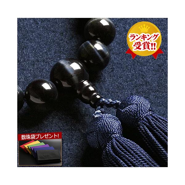 数珠 男性用 青虎目石 正絹みやこ房 念珠袋付き M-023