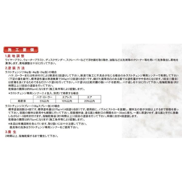 4kg(特長)●赤錆を安定なマグネタイトに転換:ラストチェンジを赤錆の上に塗装しますと時間の経過とともに安定なマグネタイトに転換し防食被膜層を形成します。 ●素地調整が簡単:ラストチェンジは錆が十分に落とせない時でも防食効果を発揮します。サンダーやパワーブラシにてケレンし、赤錆が多少残留した場合でも、防錆性能が発揮されます。そのため鉄筋のケレン処理は第三種ケレン程度で十分です。 ●塗膜は断面修復材との密着が良い:断面修復材エレホン・フィックス等を施工する際の鉄筋爆裂補修用途に最適な材料です。