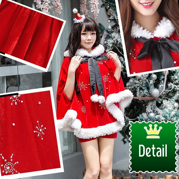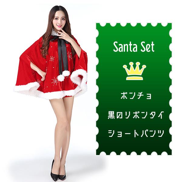 サンタガール ポンチョ&パンツ リボンタイ 3点セット サンタクロース コスプレ フード マント ケープ フリーサイズ クリスマス Xmas