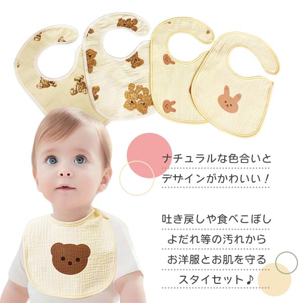 防水 U字 コットン スタイ 4枚セット よだれかけ ベビー 赤ちゃん ビブ 綿 ガーゼ 食事 ぱんだ くま うさぎ テディベア ハート ナチュラル