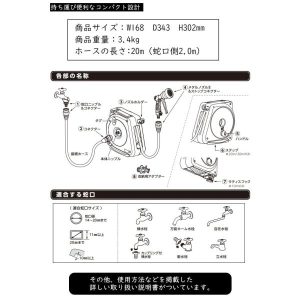 手を汚さずにホースをきれいに巻きとれ、日差しからホースを守るカバーが特徴です。ブランドロゴをあしらった木製プレートがついています。