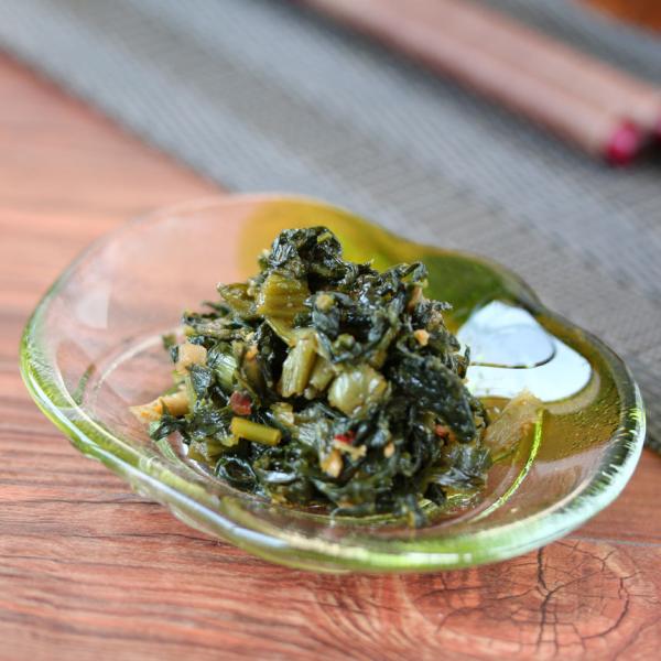 信州で採れた野沢菜を、生姜の風味豊かに、辛くないラー油で漬けてみました。