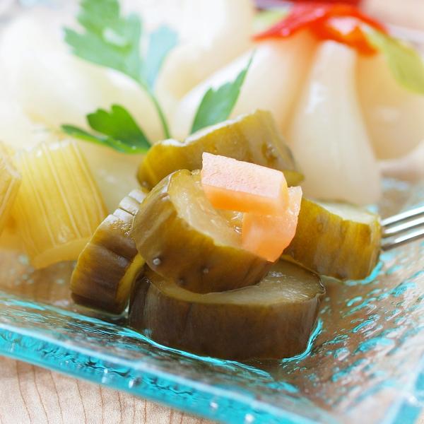 【原材料】きゅうり(国産)、人参(国産)、ローリエ、香辛料、漬け原材料(醸造酢、砂糖、食塩、たん白加水分解物、還元澱粉糖化物、しいたけエキス)、調味料(アミノ酸等)、酒精