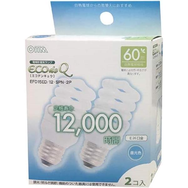 オーム電機 電球形蛍光灯 エコデンキュウ スパイラル形 E26 60形相当 昼光色 2個入 EFD15ED/12-SPN-2P