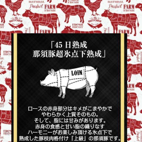 国産那須豚熟成骨付きロース肉。専門の職人が肉質を見極め市場から新鮮な枝肉で仕入れます。当店の豚肉等級はすべて上物のみ。その上物の豚肉を熟成しました。だから通常の国産豚とはレベルが違います。すでに数々の一流レストランに卸しているので自信があります。