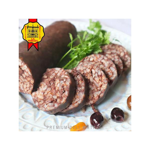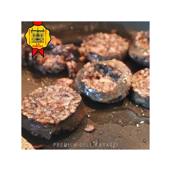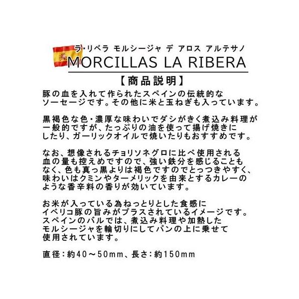 生チョリソと似ておりますが、血、米、玉ねぎが入っているのが特徴です。見た目が黒っぽいことからチョリソ・ネグロ(黒チョリソ)とも呼ばれ、スペインのバルでは、煮込み料理や加熱したモルシージャを輪切りにしてパンの上に乗せて使用されています。