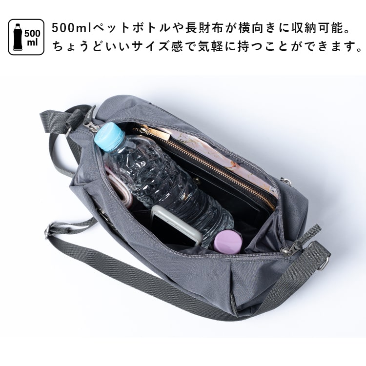 500mlペットボトルや長財布の横向き収納ができる、普段のお出かけにもアクティビティにも使いやすい大きさです。