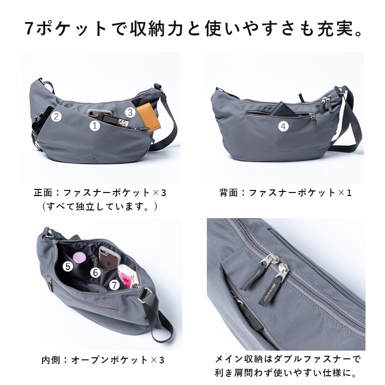 斜めの切り替えデザイン部分はファスナーポケットになっており、見た目以上の収納力も備えています。