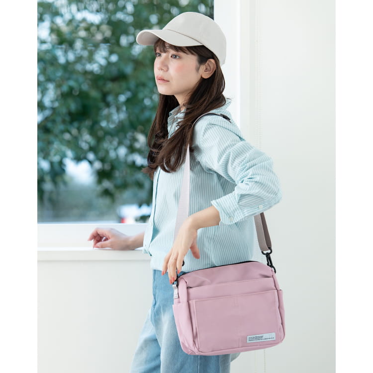 長さ調節できるストラップで、肩掛けも斜め掛けもOK。