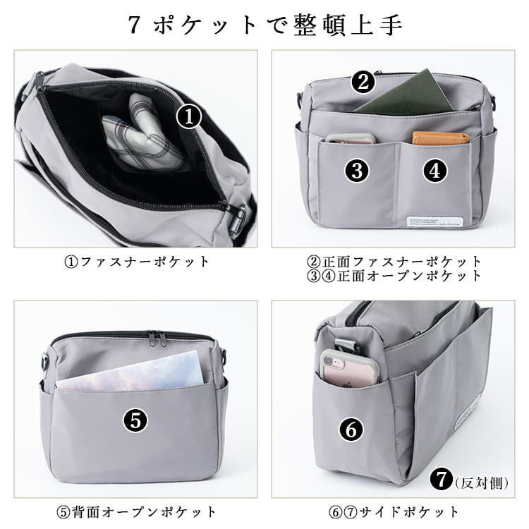 ショルダーバッグ レディース 斜め掛け 大人 軽量 撥水 7ポケット a5 大きめ ファスナー付き 自立 通勤 通学 旅行 おしゃれ