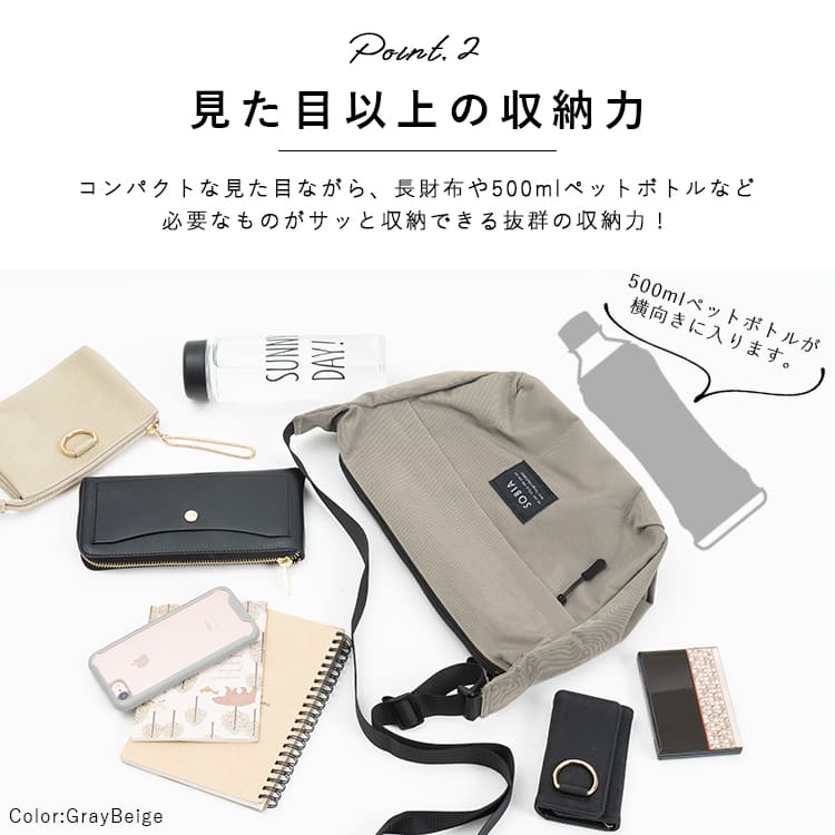 長財布やペットボトルもしっかり入り、日常使いに最適。