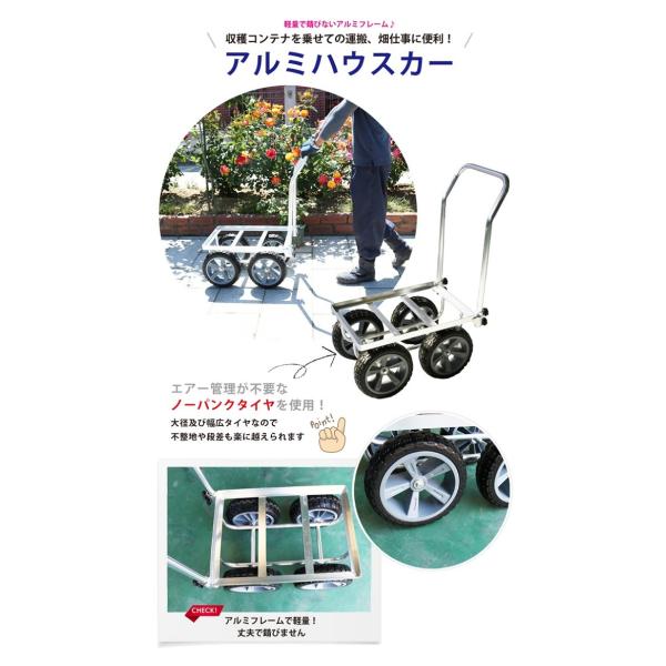 アルミハウスカー コンテナ1個積用 大型10インチノーパンクタイヤ 収穫台車 アルミ運搬車 KIKAIYA
