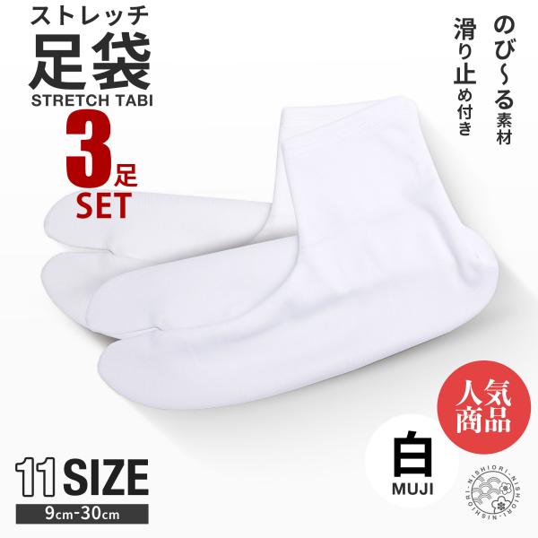 3足セット ストレッチ 白 足袋 9cm - 30cm 足袋ソックス 子供用 大人用 滑り止め付き 単衣足袋 こはぜなし 口ゴム