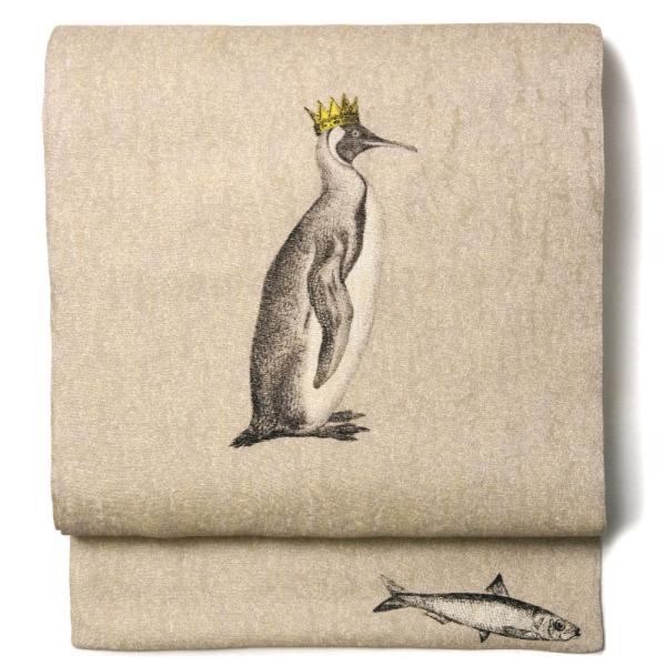 名古屋帯 ペンギン 王冠 魚 ベージュ メルヘン 童話 絹 日本製 お太鼓 仕立て上がり