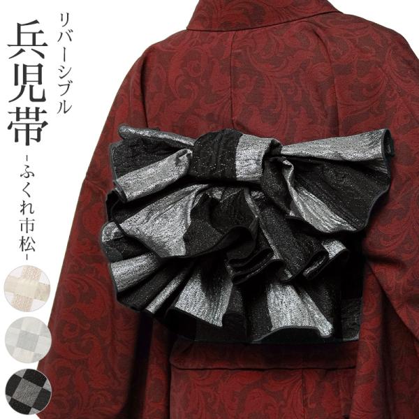 兵児帯 ふくれ織 市松 オフ白 ブラック グレー ベージュ リバーシブル 着物 浴衣 シック エレガント シンプル ラメ 金糸 銀糸 和装 モダン へこ帯 大人 お太鼓
