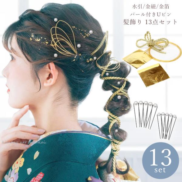 髪飾り 金箔 水引 組紐 パール 13点セット Uピン 水引アレンジ 成人式 結婚式 謝恩会 卒業式 七五三 ドレス 浴衣