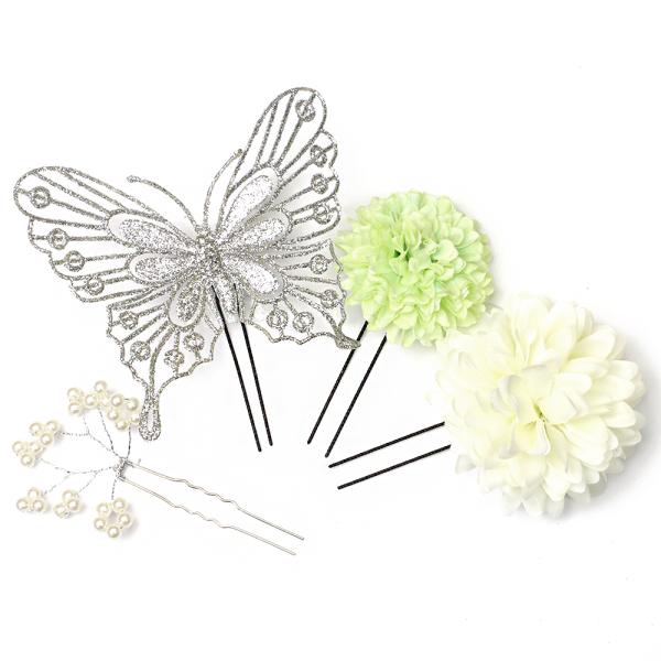 髪飾り 成人式 振袖 袴 花 4点セット シルバー 薄若緑色 白 ラメ 蝶 蝶々 浴衣 和装 着物 No.9-3750