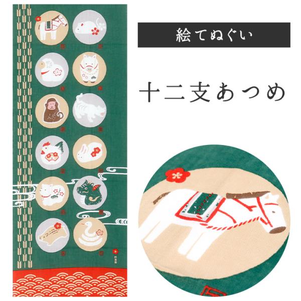 十二支あつめ 濱文様 てぬぐい 絵てぬぐい タペストリー 季節柄 干支 十二支 グリーン 緑 横浜捺染 伝統技術 モダン インテリア 壁掛け