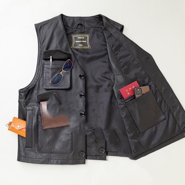 ロベルトリッチ ラム革 10ポケットベスト(ラム革ベスト 多機能ベスト ポケット付き 前ポケット サイドポケット) 1-2W