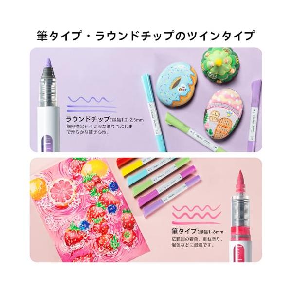 ・?筆・ラウンドのツインタイプ:柔らかい筆タイプのペン先は、筆圧をコントロールすることで線の太さを自由に表現。初心者でも扱いやすく、だれでも気軽に楽しむことができるアクリルマーカーです。弾力性があるラウンドのペン先は、様々な表面に適用します。