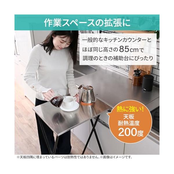 ・熱に強いステンレス天板天板はお手入れカンタンなステンレス製で、耐熱温度200度と熱にも強い仕様です。※天板四隅に埋まっているパーツは耐熱性ではありませんので熱い鍋等が直接あたらないようにご注意ください。