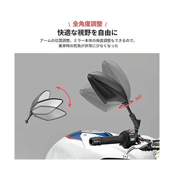 ・広い視界ミラーとアーム間でボールジョイントなので、360°調整。快適な視野を自由に調整できます。また、このミラーは凸面鏡を設計なので、平面鏡より視野も広いです。