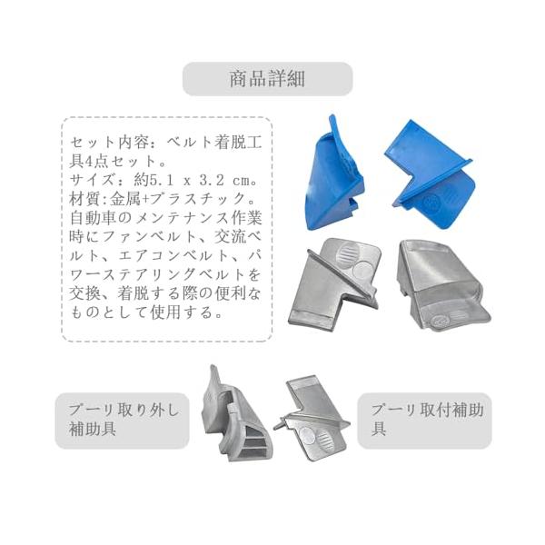 セット内容ベルト着脱工具4点セット、サイズ:約5.1 x 3.2 cm、自動車のメンテナンス作業時にファンベルト、交流ベルト、エアコンベルト、パワーステアリングベルトを、着脱する際の便利なものとして使用する。