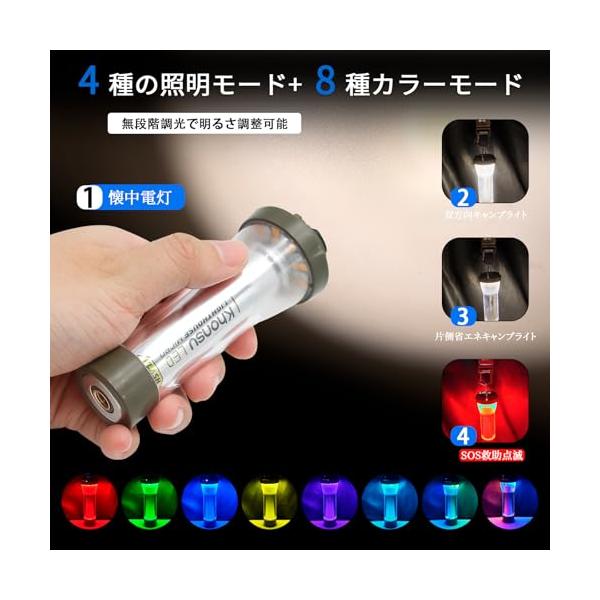 ・12種類ライトモード搭載:4種照明モード+8種類カラーモード(ニーズに合わせて照明モードを切り替えられ、キャンプの明かりからパーティーの雰囲光まで、幅広く対応。好みや雰囲気に応じて光の色を変更でき、空間の雰囲気を自由に演出することができます。?