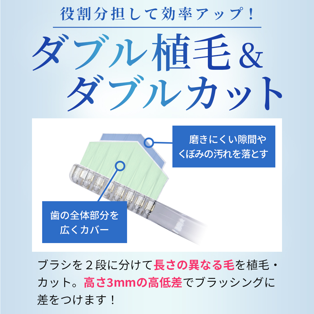 2. ダブル植毛&ダブルカット構造により、毛先が隙間に入った際にも外側の毛が中心の毛を支えることによって除去力をサポート!