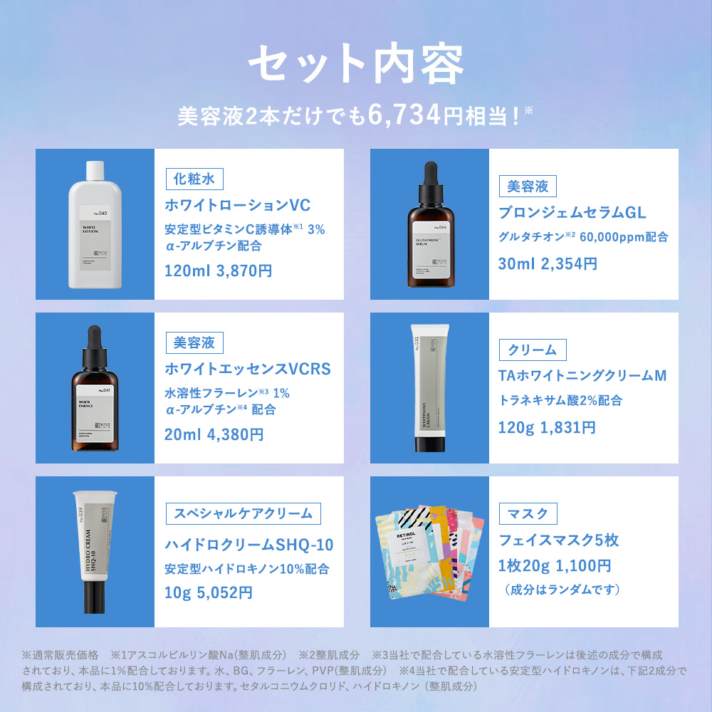 KISO CARE キソケア スキンケアセット トライアルセット コフレセット 福袋 ラッキーバッグ 化粧水 美容液 フェイスクリーム クリーム スペシャルケアクリーム フェイスパック シートパック フェイスマスク ビタミンC誘導体 ビタミンC ビタミンC化粧水 グルタチオン グルタチオン美容液 水溶性フラーレン フラーレン フラーレン美容液 アルブチン トラネキサム酸 トラネキサム酸クリーム 安定型ハイドロキノン ハイドロキノン ハイドロキノンクリーム 敏感肌 くすみケア 透明感 エイジングケア 保湿 しっとり 高濃度 高配合 レディース 女性 メンズ 男性 基礎化粧品 20代 30代 40代 50代 60代 70代日本製 国産 プレゼント ギフト 贈り物 誕生日 母の日 母の日ギフト 母の日プレゼント