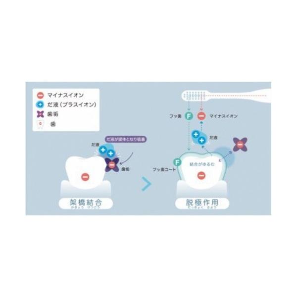 フッ素とイオンのWパワー!フッ素は、歯垢「プラーク」の細菌の活動を抑えます。虫歯の予防に有効な成分として注目されています。