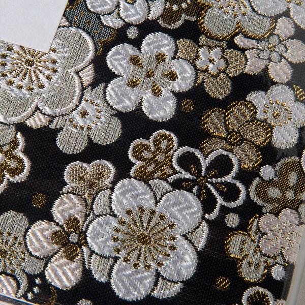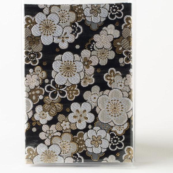 ビニールカバー付き御朱印帳 納経帳 黒地に梅佳境 大判12x18cm 西陣金襴 蛇腹式