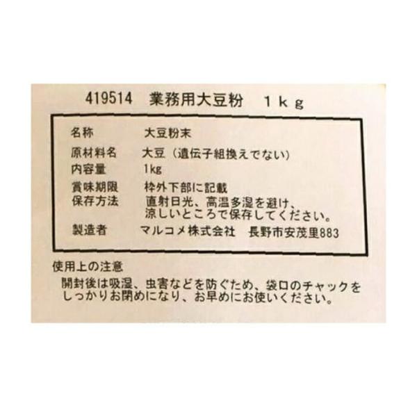 名称:マルコメ 大豆粉原材料名:大豆内容量:1kg賞味期限:枠外下部に記載保存方法:直射日光を避け、高温多湿を避け保存してください販売者:株式会社コーエー商会福島県郡山市大槻町字古屋敷27番遠藤ビル2号