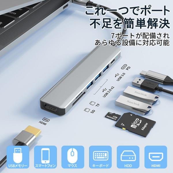 ドッキングステーション Type-C USBハブ 7ポート USB3.0 変換アダプター PD充電 7in1 ハブ HDMI出力 USB3.0対応 SDカードリーダー TFカードリーダ