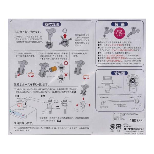 ◇◇ 傷んだ給水ホースを簡単交換。ジョイント部抜け防止機能付き。 各メーカーの自動洗濯機給水ホースに合います。(1992年以降) 特徴 ・各メーカーの自動洗濯機に合います。 ・ホースがワンタッチで着脱できます。 ・ロックレバーが元口のツバ部にカチッと接続する事によりジョイント部の抜けを防止します。 ・ホースの水漏れ、移動時に! ・東芝、NEC以外の国内メーカーの全自動洗濯機に付属している口金にはそのまま使用でき ますが、合わない場合は本品付属の口金をお使い下さい。 ロックレバーが口元のツバ部にカチッと接続することにより、ジョイント部の抜けを防止します。ホースがワンタッチで着脱可能。