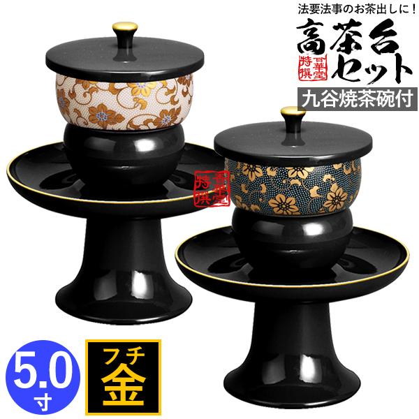 日本製 高茶台セット 黒(フチ金) 九谷焼茶碗付(青粒鉄仙/白粒鉄仙) 5.0寸 奥行15.0cm×15.0cm×18.5cm
