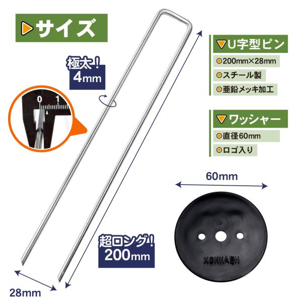 防草シート ピン 極太 亜鉛メッキ シート押さえ ワッシャー付 100本組 ピン シート押え ピン 押さえピン マルチ Uピン杭 長さ20cm 太さ4mm