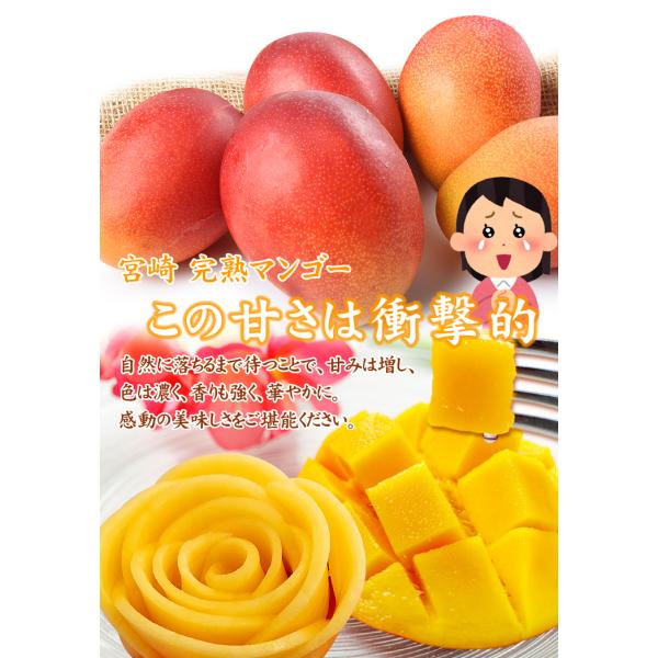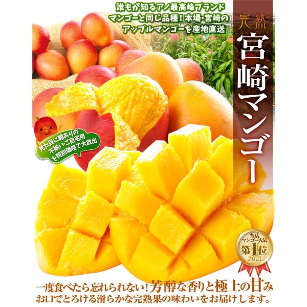 ●商品情報:南国・宮崎の強い日差しと温暖な気候に恵まれた、濃厚な甘みと強く豊かな香りのアップルマンゴー。自然落下するまで完熟したあま〜い宮崎マンゴーを、訳あり品として大奉仕!