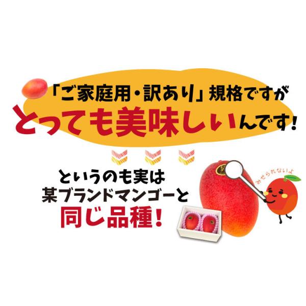 ●商品情報:南国・宮崎の強い日差しと温暖な気候に恵まれた、濃厚な甘みと強く豊かな香りのアップルマンゴー。自然落下するまで完熟したあま〜い宮崎マンゴーを、訳あり品として大奉仕!