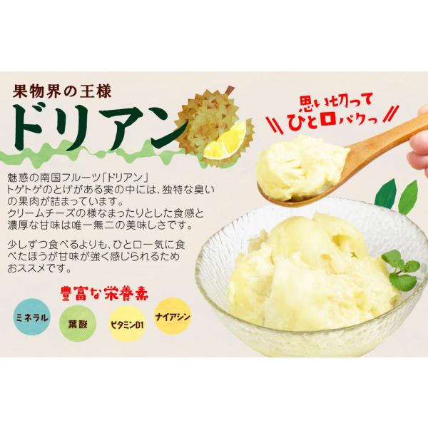 独特の香りとクリーミーで濃厚な甘味!好きな人にはたまらない、果物界の魔王・ドリアンを、果肉だけを取り出して、いつでも手軽に楽しめる冷凍フルーツに。半解凍ならニオイも控えめで、ドリアン初心者にもおすすめ。