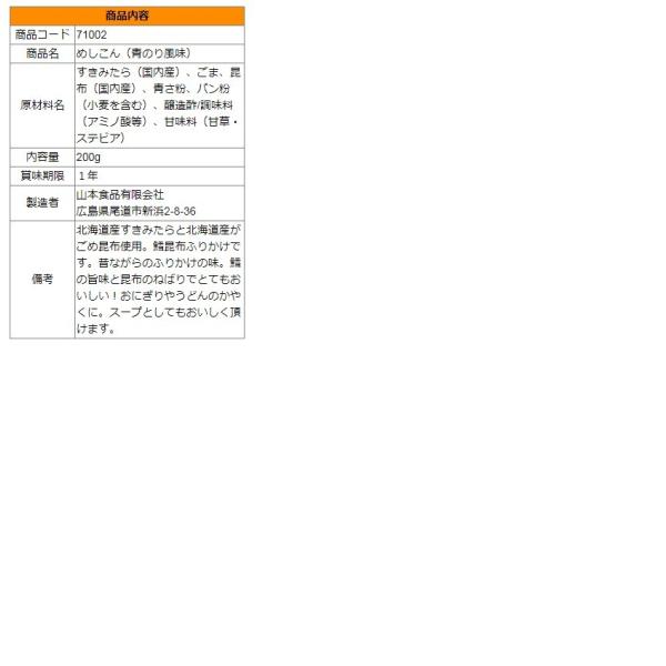備考 北海道産すきみたらと北海道産がごめ昆布使用。鱈昆布ふりかけです。昔ながらのふりかけの味。鱈の旨味と昆布のねばりでとてもおいしい!おにぎりやうどんのかやくに。スープとしてもおいしく頂けます。