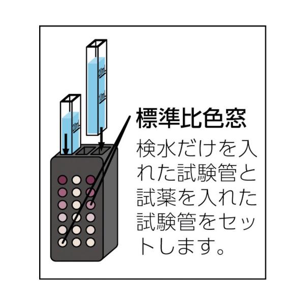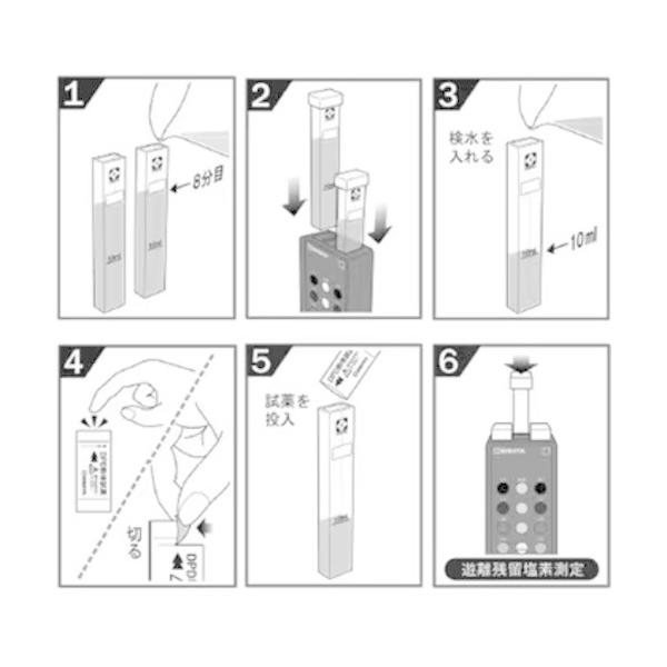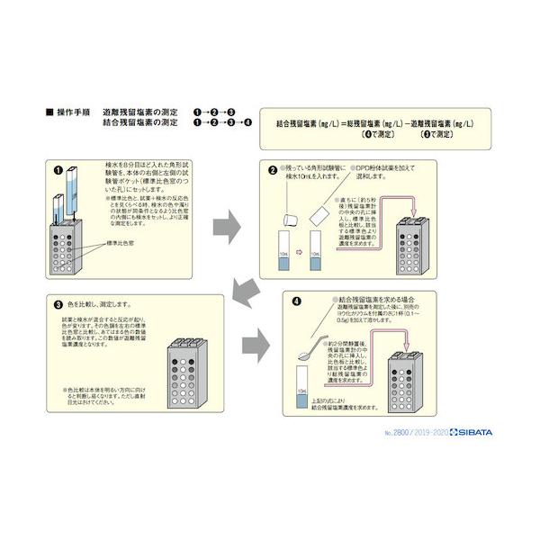 SIBATA 水質検査材|特長:残留塩素を含む水にDPD試薬を加えることで残留塩素の量を測定します。 別売のヨウ化カリウム試薬(品番080540・511)を使用することで遊離残留塩素と結合残留塩素の区別が明確につけられます。 本測定器は、残留塩素を含む水にDPD試薬を加えたとき特異的に反応し、残留塩素の量に応じて淡赤紫色を呈する反応に基づく簡易測定方法です。