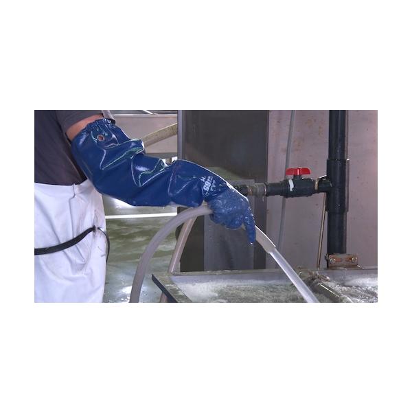 SHOWA 腕カバー付手袋(天然ゴム手袋)|特長:指先から肩口まで継ぎ目のない一体型ニトリル製ロング手袋です。 継ぎ目がないため、手袋と腕カバーの接合部から破れる心配がなく丈夫です。 指先を4重コートで強化しています。