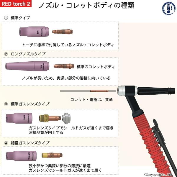 アルゴンガスなどを使用したティグ溶接を行う際の溶接トーチの消耗品で、コレット、タングステン電極と組み合わせて使用します。