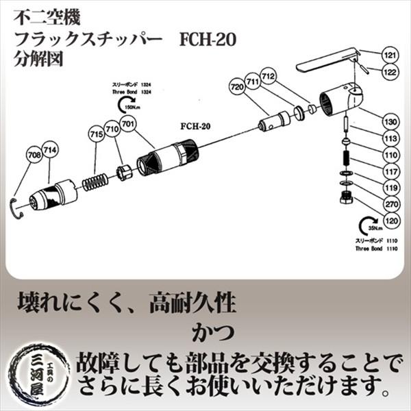不二空機フラックスチッパFCH-20は高耐久かつ、部品供給も行われます。仮に故障しても、部品取りで簡単に修理をすることができるため、コストパフォーマンスが高い商品です。FCH-20は簡単に分解することができ、消耗品であるタガネ等の交換も簡単に行うことができます。