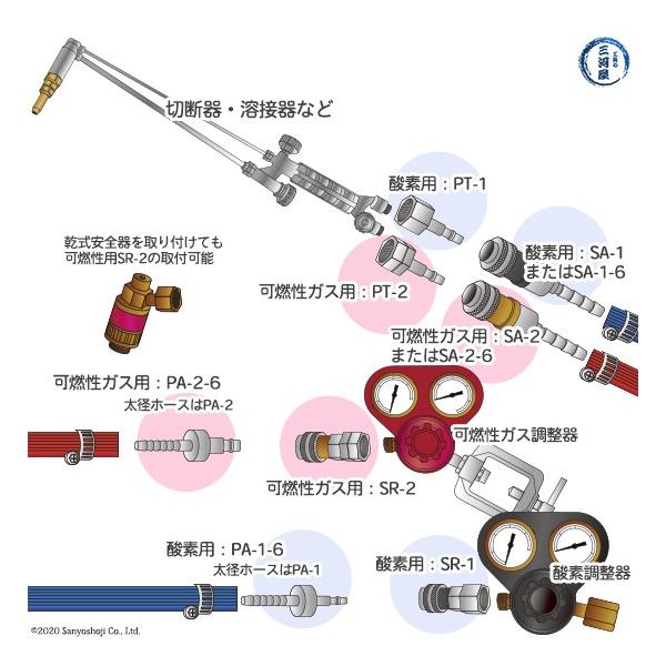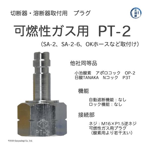 ヤマト産業の切断器・溶接器に取り付けるアセチレン、LPなどの可燃性ガス用のワンタッチカプラ OKコックPT-2(PT2)です。可燃性ガス用プラグ×ネジはM16×P1.5(左ねじ)で、SA-2やSA-2-6などの可燃性ガス用のソケットに取り付け可能です。